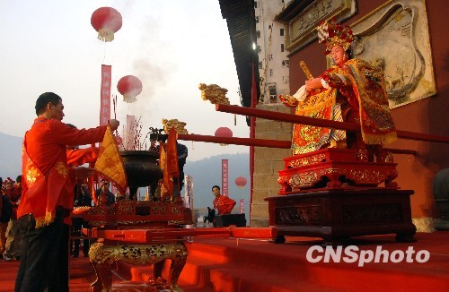 10月23日上午,主祭在福建古田大桥镇临水宫祖庙上香恭请陈靖姑金身起驾巡安台湾。台湾以顺天圣母陈靖姑为主神的宗庙有400多座,配祀有顺天圣母神位的寺庙多达300多座,信众遍布台湾全岛。中新社发 王东明 摄