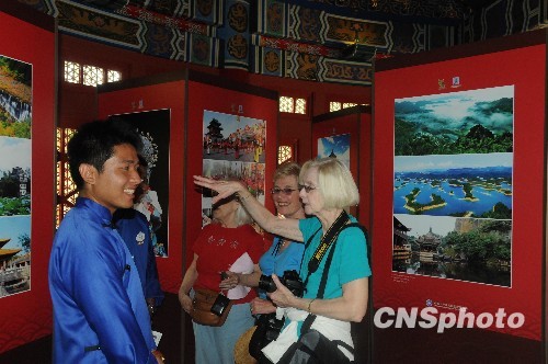 图为美国观众在参观世博会图片展时对中国及世博会充满兴趣。中新社发 吴庆才 摄