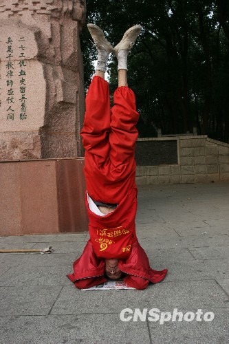 2009年10月23日,91岁的肖清连老人在武汉市施洋烈士公园内表演“功夫”,吸引了围观者。中新社发 孙新明 摄