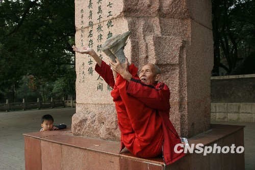 2009年10月23日,91岁的肖清连老人在武汉市施洋烈士公园内表演“功夫”,吸引了围观者。中新社发 孙新明 摄