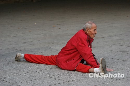 2009年10月23日,91岁的肖清连老人在武汉市施洋烈士公园内表演“功夫”,吸引了围观者。中新社发 孙新明 摄
