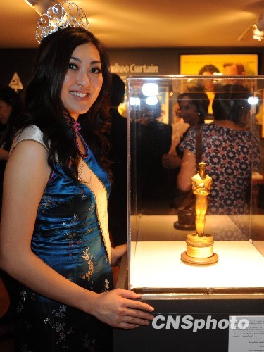 图为洛杉矶华埠小姐与小金人合影。中新社发 张炜 摄