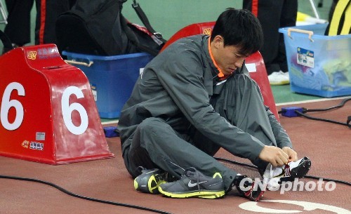 “飞人”刘翔亮相全运会110米栏预赛。刘翔脚穿一黑一白的“阴阳鞋”引起了不少人的关注。据悉,刘翔脚穿不同跑鞋是为了更好的保护还未痊愈的脚伤。中新社发 汤彦俊 摄