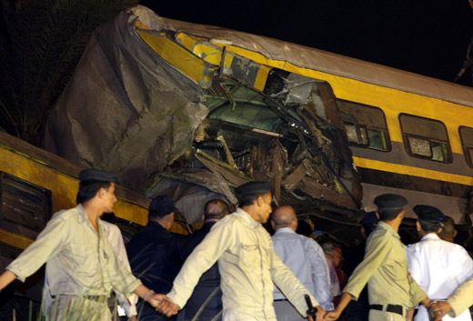 10月24日,在埃及首都开罗以南约50公里的加尔扎村,两列客运列车在这里相撞,造成至少25人死亡,55人受伤。图为救援人员在火车相撞事发现场展开救援。