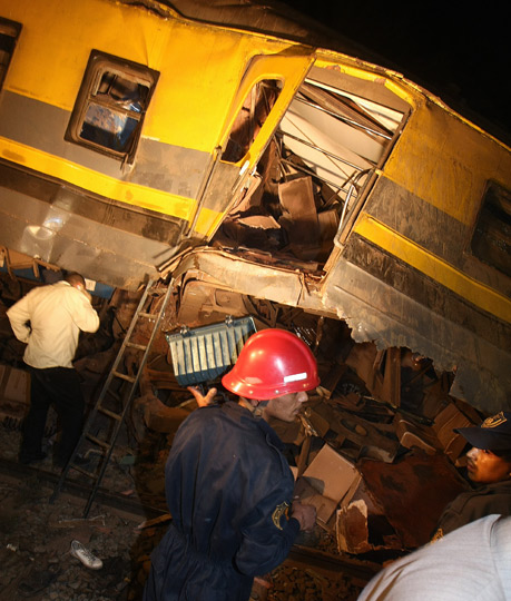 10月24日,在埃及首都开罗以南约50公里的加尔扎村,两列客运列车在这里相撞,造成至少25人死亡,55人受伤。图为救援人员在火车相撞事发现场展开救援。