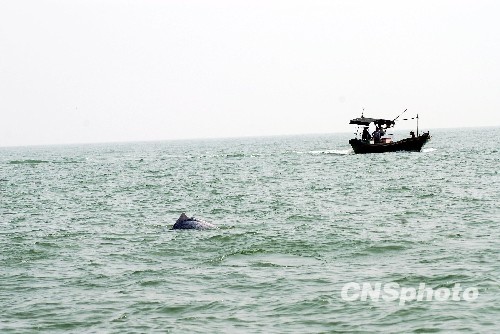 10月23日,一群可爱的中华白海豚出现在广东湛江市东海岛龟头村附近海域。中新社发 李满青 摄