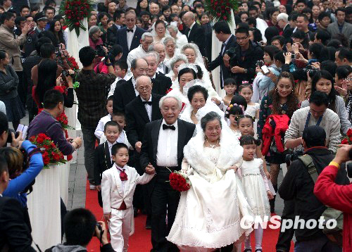 10月24日,重庆观音桥广场,重庆市人民政府、市民政局正在为从全市网络投票推选出来的十佳金婚夫妇举行金婚庆典。中新社发 贺终荣 摄