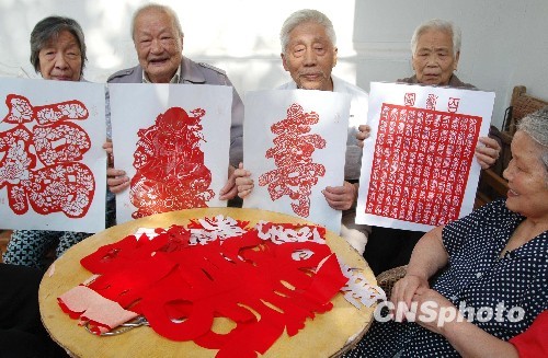 10月23日,苏州剪纸艺人章维伟到苏州观前敬老院和这里的老人们一起创作剪纸“寿”字。充满趣味的剪纸创作艺术,让老人们感受到重阳节的快乐。中新社发 苏民 摄