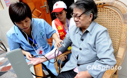 10月25日,福州市红十字会志愿者来到仓山区仓前街道龙峰社区为88岁高龄的孤寡老人罗秀敏义诊。中新社发 刘可耕 摄