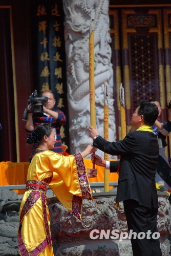 图为主祭人湖南省株洲市人民政府市长王群向中华民族始祖炎帝神农氏敬献高香。中新社发 周利朔 摄