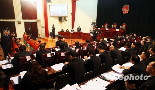 10月26日上午9时30分,重庆打黑除恶系列案中又一起备受关注的案件--黎强涉黑团伙案在重庆市第五中级人民法院公开开庭审理。公诉机关指控,黎强犯组织、领导黑社会性质组织罪、聚众扰乱社会秩序罪、非法经营罪、行贿罪等9项罪名。图为庭审现场。 中新社发 武中元 摄