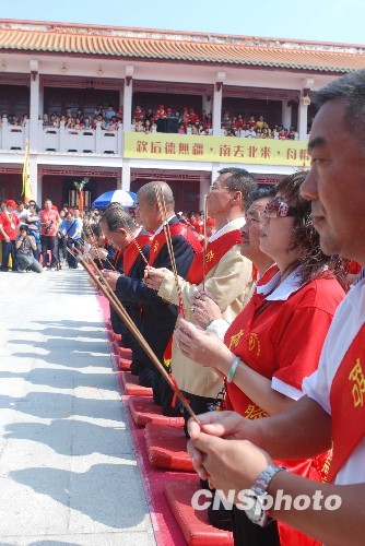 第七届澳门妈祖文化旅游节开幕式暨妈祖祭典仪式,十月二十六日在澳门叠石塘山妈祖文化村天后宫盛大举行。图为来自各地妈祖庙的代表作为陪祭向妈祖行三拜九叩礼。中新社发 毕永光 摄