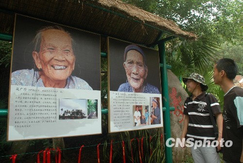 10月26日,重阳佳节,海南三亚南山长寿谷内,由百名百岁老人的百张笑容、生活剪影组成的“世纪笑容长廊”图片展览吸引游人关注。中新社发 尹海明 摄