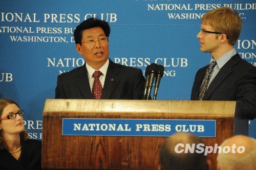 图为10月26日,魏家福受邀在美国国家记者俱乐部中美贸易等问题发表演讲。中新社发 吴庆才 摄