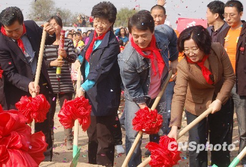 10月27日,国际巨星成龙来到河北省滦南县,捐款100万元人民币,帮助滦南县姜泡小学改扩建成龙子心小学,这已经是成龙在大陆捐建的第23所龙子心小学。图为成龙和小学校教师等一同为龙子心小学奠基。中新社发 翟羽佳 摄