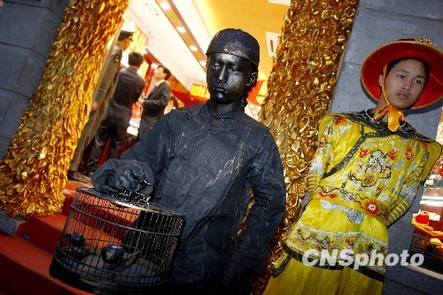 10月27日,一位真人装扮的“铜人雕塑”与“皇帝”在北京前门大街一家新开张的商铺门前招揽顾客。中新社发 郑雄增 摄