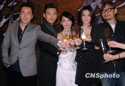 图为王中磊、苏有朋、周迅、李冰冰、陈国富(左至右)举香槟庆祝。中新社发 李学仕 摄