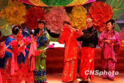 10月27日晚,中国固始根亲文化节“根之声”文艺晚会上,上演了流传于河南、安徽、湖北三省交界处的民间稀有戏种——灶戏《郭丁香出嫁》。《郭丁香出嫁》是《郭丁香》其中的一折,唱腔中融合了当地花篮戏、倒七戏、端公戏、大鼓书的声韵,并且还有豫南民歌的风韵,具有独特的艺术形式。是河南省非物质文化遗产重点保护项目之一。中新社发 向明超 摄