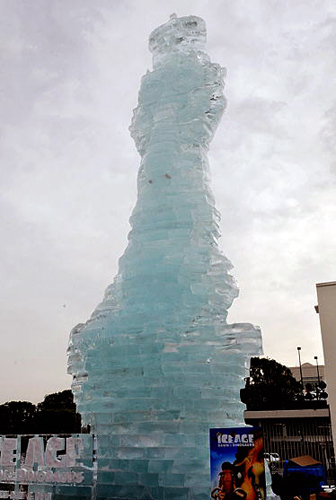 图为一座造型为电影《冰河世纪:恐龙的黎明》中小松鼠的巨型冰雕耸立在广场上。