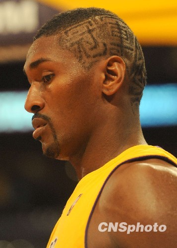 图为昔日姚明队友、刚刚转会至湖人队的罗恩·阿泰斯特,全场得到10分,他的新发型赫然印着繁体中文“冠军” 。中新社发 张炜 摄