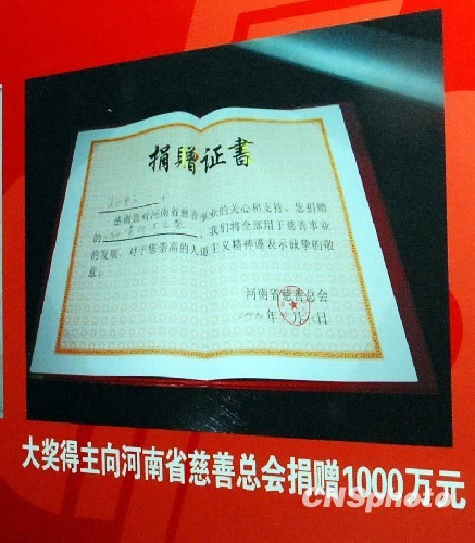 10月28日,河南省福彩中心就“3.599亿彩票巨奖”举行新闻发布会,新闻发言人李广云介绍,河南安阳巨奖得主安先生兑奖时带墨镜口罩,举止轻松,心态良好,当场捐给河南省慈善总会1000万元,60万元定向捐助给扶沟县患尿毒症的女孩鄢某。中新社发 王中举 摄