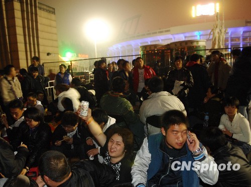 10月28日晚间,北京国安队的球迷在工人体育场外排队守候,等待中国足球超级联赛最后一战北京国安主场迎战浙江绿城的球票开售。由于北京国安很有可能25年来首次夺得冠军,主场最后一战成为球迷关注焦点。中新社发 侯宇 摄