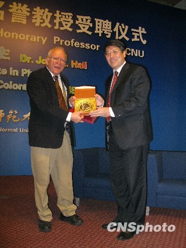 10月28日,第四次造访华东师范大学的诺贝尔物理学奖获得者、美国国家标准与技术研究院高级研究员——约翰·霍尔正式受聘成为华东师范大学名誉教授。约翰·霍尔以“光学频率梳”技术发明获得殊荣,其在激光实验领域成就享誉国际,原本仅用于实验室研究的激光已经发展成为现代科学基本工具之一。约翰·霍尔最近一项专利为“机场嗅探技术”。