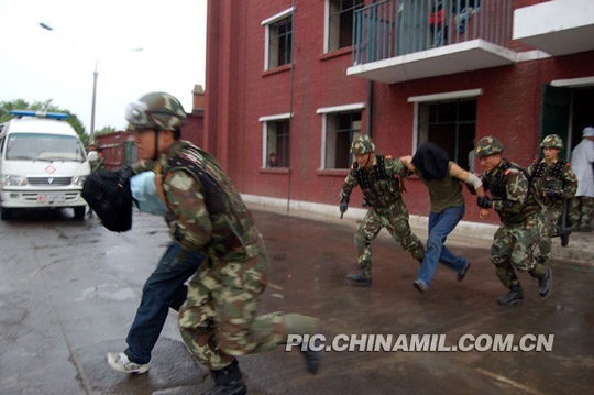 9时30分,只见56名全副武装武警特战队员在现场指挥员作出“3,2,1,开始攻击”的命令后,只听“呯、呯”几声巨响,几名特战队员索降如神兵天降般突入会议室,将1名危险分子当场“击毙”;另几名突击队员利用拉钩钩住卷帘门,同时起爆破门装置、导爆索和聚能切割炸药,对门、窗、墙实施了瞬间爆破;其他几名突击队员利用突击车攀上三楼破窗突入屋内,将企图持械顽抗的其他2名危险分子“击毙”,7名危险分子被生擒,20名人质被安全解救。
