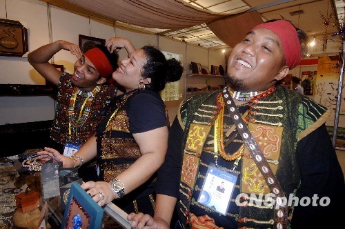 图为台湾排湾人在文博会上热情推销该族特有的饰物。中新社发 王东明 摄