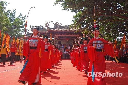 10月29日,“二OO九温陵妈祖会”在侨乡泉州天后宫隆重举行,活动邀请了台北、台中、彰化、嘉义等地65个宫庙约300名信众及福建主要妈祖宫庙信众1000人参加。在巡安踩街民俗活动后,泉州天后宫举行了盛大的“仿古祭祀”仪典。三跪九叩、敬献花果、诵祝文、献舞,中华古老传统的祭祀礼仪,让来自台湾的嘉宾们感到熟悉和亲切。 中新社发 傅丹丹 摄