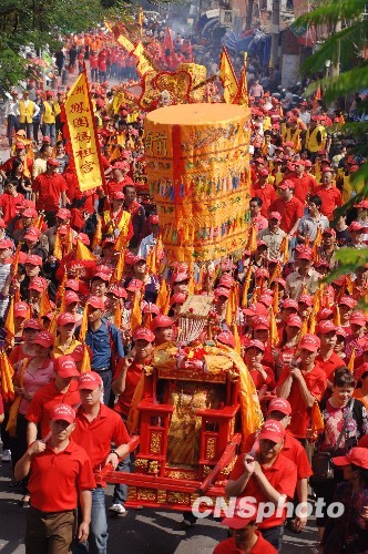 10月29日,为庆祝“妈祖信俗”入选联合国人类非物质文化遗产代表作名录,“二OO九温陵妈祖会”在侨乡泉州天后宫举行。这是泉州天后宫妈祖神像首次走出宫庙,与泉州各妈祖宫庙神像一道沿市区踩街绕境,声势浩大。中新社发 傅丹丹 摄