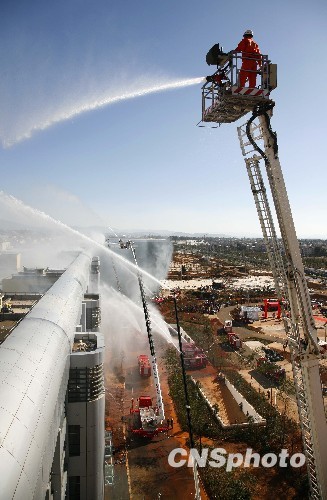 图为商贸城外水炮灭火。中新社发 刘冉阳 摄