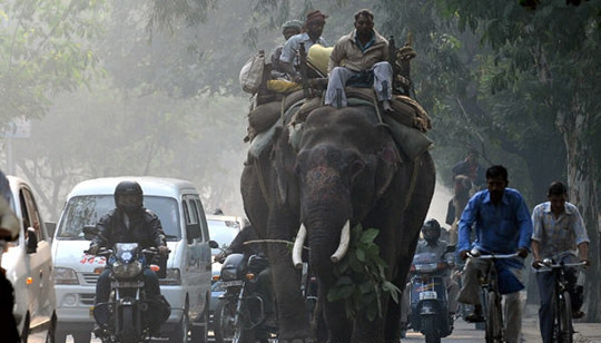 10月29日,在印度首都新德里,大象与汽车、摩托车、自行车一同在马路上行进。在印度街头,人们经常能看见大象招摇过市。