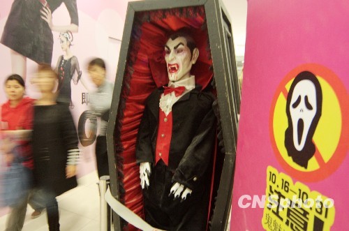 10月29日,万圣节将至,北京一家商场摆放“吸血鬼、僵尸、骷髅”等仿真玩偶。其中一人多高的“吸血鬼”仿真玩偶,把顾客吓得纷纷绕道而行。据商场的工作人员介绍,为了迎接万圣节活跃气氛才特意摆出各种玩偶,也有胆大的顾客特意要跟“鬼玩具”合影。 中新社发 吴芒子 摄