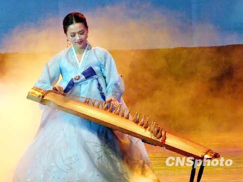 10月29日,朝鲜平壤艺术团在南宁剧场给南宁观众献上了一台大型歌舞“盛开的金达莱”。此次演出,汇集了朝鲜血海歌舞团、朝鲜万寿台艺术团和朝鲜国立民族艺术团这三大朝鲜顶尖团体同台献艺,其中,众多功勋演员。中国观众熟知的《阿里郎》、《卖花姑娘》等朝鲜经典民谣接着依次上演,此外,晚会专门为中国观众带来了《祝你平安》和《好日子》等中文曲目。中新社发 骆文刚 摄