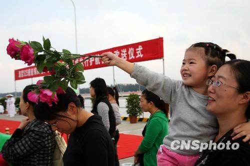 10月30日上午,中国海军“马鞍山”号、“温州”号两艘新型导弹护卫舰从浙江舟山东海舰队某军港解缆启航,远赴亚丁湾、索马里海域执行护航任务。“马鞍山”舰和“温州”舰将与正在亚丁湾执行第三批护航任务的“千岛湖”号综合补给舰,以及两架舰载直升机、数十名特战队员等组成中国海军第四批护航编队,整个编队共计700多人,接替第三批护航编队执行在亚丁湾、索马里海域的护航任务。图为一位护航官兵的妻女前来送行,亲情自然流露,场面温馨。中新社发 孙自法 摄