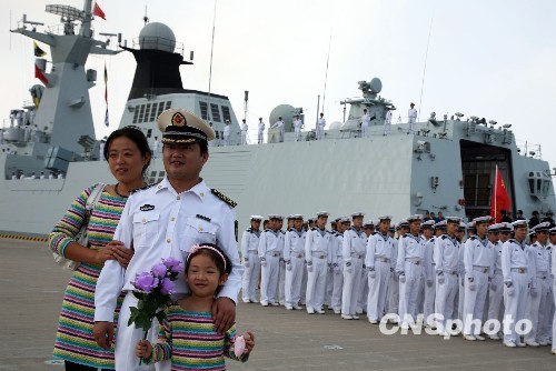 护航官兵与前来送行的妻子女儿在军港码头上合影。 中新社发 孙自法 摄