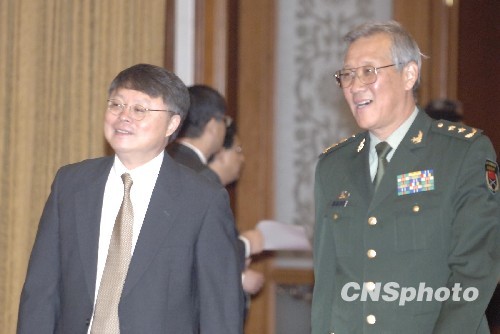 10月30日,中国科学院建院60周年纪念会在北京人民大会堂隆重举行,中科院副院长江绵恒、总装备部副部长李安东共同步入会场。中新社发 徐曦艺 摄