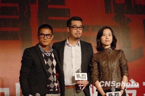 图为主角郭富城、导演周显扬、编剧杜致朗在发布会现场。中新社发 李学仕 摄