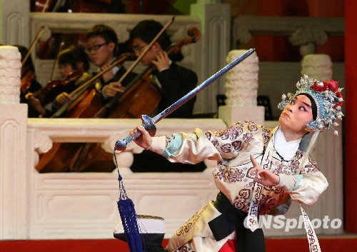 10月31日晚,中国人民大学学生艺术团正在表演“交响乐京剧”——《野猪林》,京剧的唱腔配上交响乐伴奏,显得分外别致。此节目作为第二届世界汉学大会的专场音乐会,以中西合璧的艺术表达方式受到了诸位专家,尤其是国外汉学家的称赞。中新社发 苏丹 摄