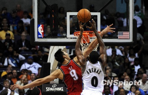 图为易建联防守对方头号得分手阿里纳斯。中新社发 李静 摄