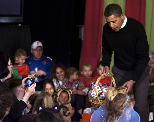10月31日是西方的“万圣节”,超过2000名美国儿童到白宫过万圣节,总统奥巴马夫妇亲自按照传统分发糖果。
