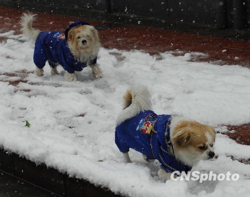 11月1日上午,北京市一居民小区内两条身着防寒衣的小狗结伴在大雪中散步。中新社发 侯宇 摄