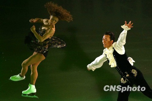 11月1日,2009年中国杯世界花样滑冰大奖赛答谢表演在北京首都体育馆进行,所有参赛运动员为观众奉献上了一场冰上舞蹈盛宴。图为中国著名花样滑组合申雪、赵宏博为在场观众献上了完美的冰上爱情,两人在退役两年后复出,并在此次赛事中取得了双人滑第一名的好成绩。中新社发 富田 摄