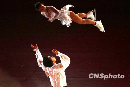 图为中国著名花样滑组合申雪、赵宏博为在场观众献上了完美的冰上爱情,两人在退役两年后复出,并在此次赛事中取得了双人滑第一名的好成绩。中新社发 富田 摄