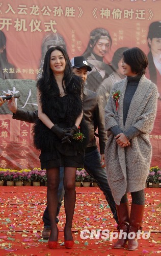 11月1日,温碧霞、周海媚、庹宗华、何美钿,徐少强等众主演齐聚山东梁山,为数字影片《水浒人物谱》助阵。此次,温碧霞将出演108将之一杨雄之妻潘巧云。而周海媚更是一改玉女形象,竟然演起“母大虫”孙二娘,让人大跌眼镜。图为剧中时迁的扮演者香港当红小生连凯“躲”在温碧霞、周海媚两位美女身后。中新社发 李学仕 摄