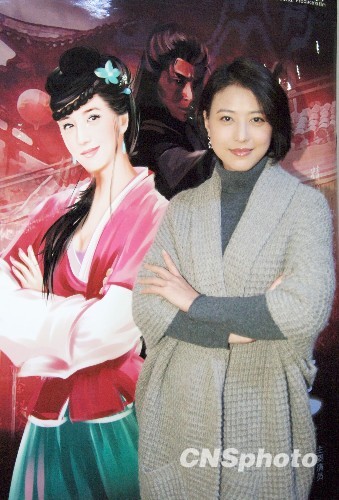 图为周海媚与剧中孙二娘CG造型合影。她表示孙二娘刚强而又妩媚,其实很适合自己。中新社发 李学仕 摄