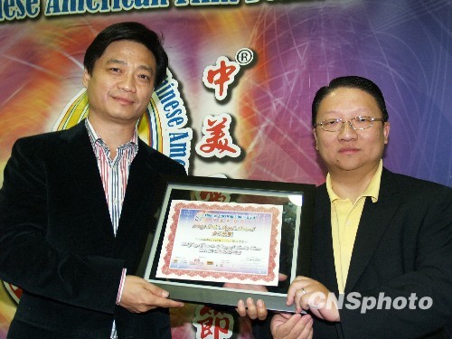 10月31日,中美电影节主席苏彦韬在洛杉矶向中国中央电视台知名节目主持人崔永元颁发“2009中美电影节杰出贡献奖”。中新社发 卢威 摄