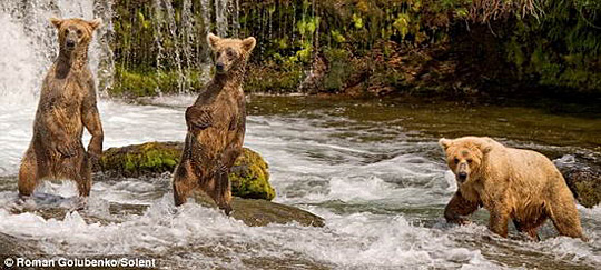 几只熊正在河对岸捕鱼,听到巨响也好奇地望过来,看看到底发生了什么事,有两只熊非常“八卦”,居然站起来看热闹。