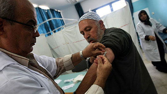11月1日,即将赴麦加朝觐的巴勒斯坦人在加沙排队接种流感疫苗。沙特阿拉伯政府要求今年赴麦加朝觐人员都接种普通流感疫苗或甲型H1N1流感疫苗。